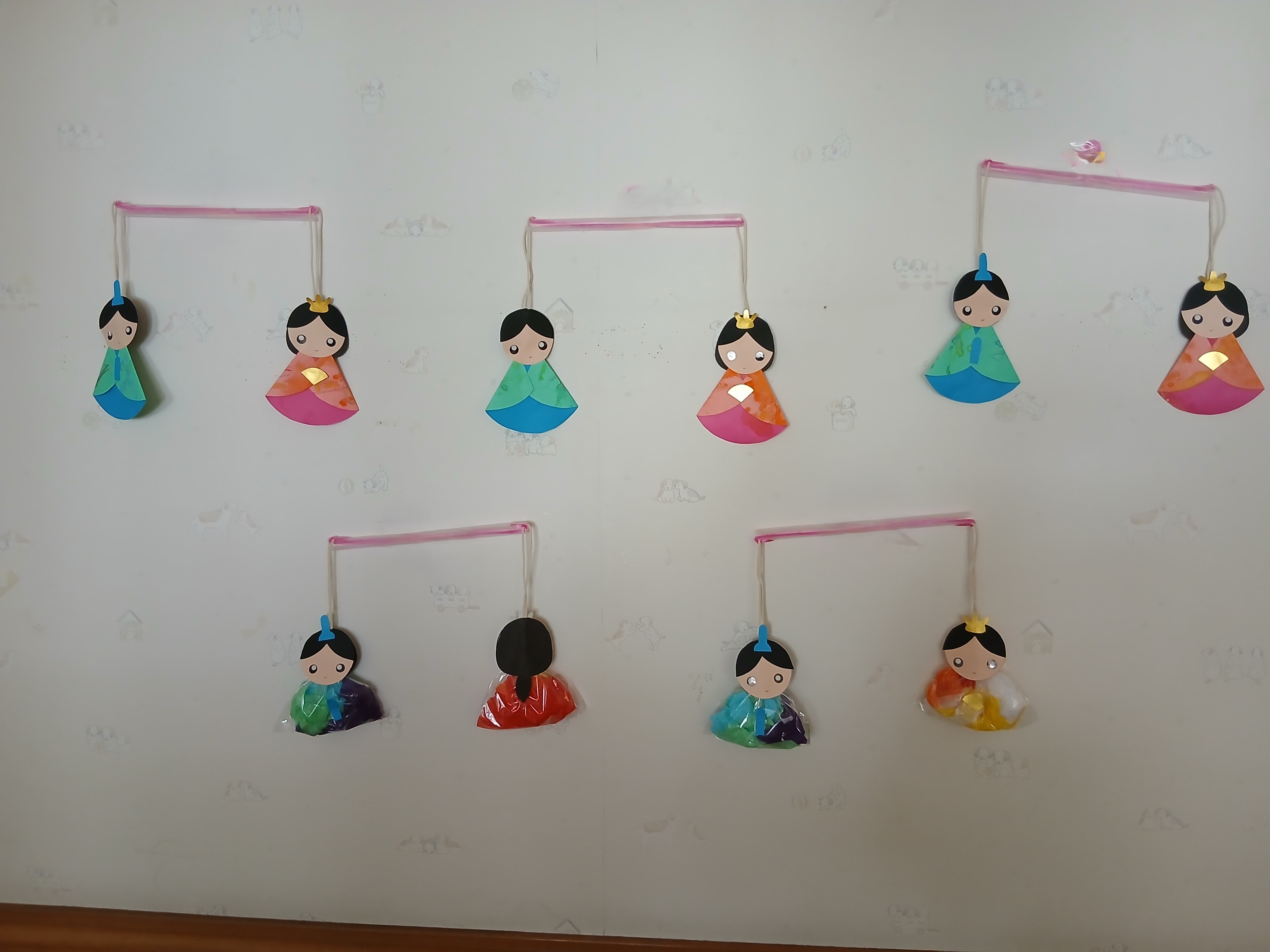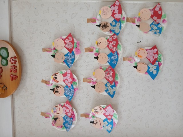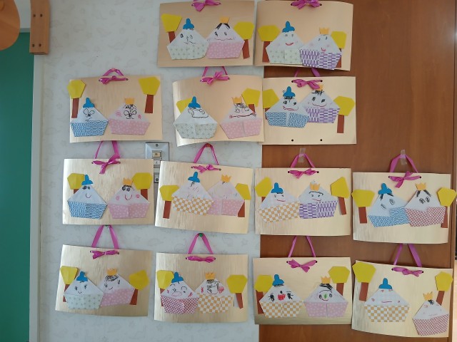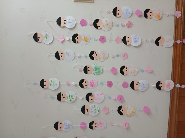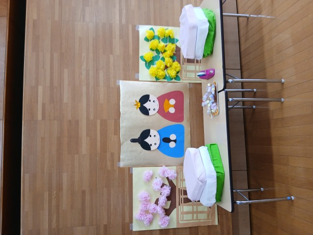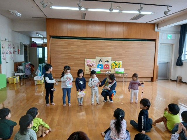 ひなまつり!ということで、クラスそれぞれかわいい、お内裏様とお雛様を作って飾りましたよ。ホールでの集いでは、ゲーム方式でみんなで協力して大きなお内裏様とお雛様に、おはなや菱餅を飾りました。