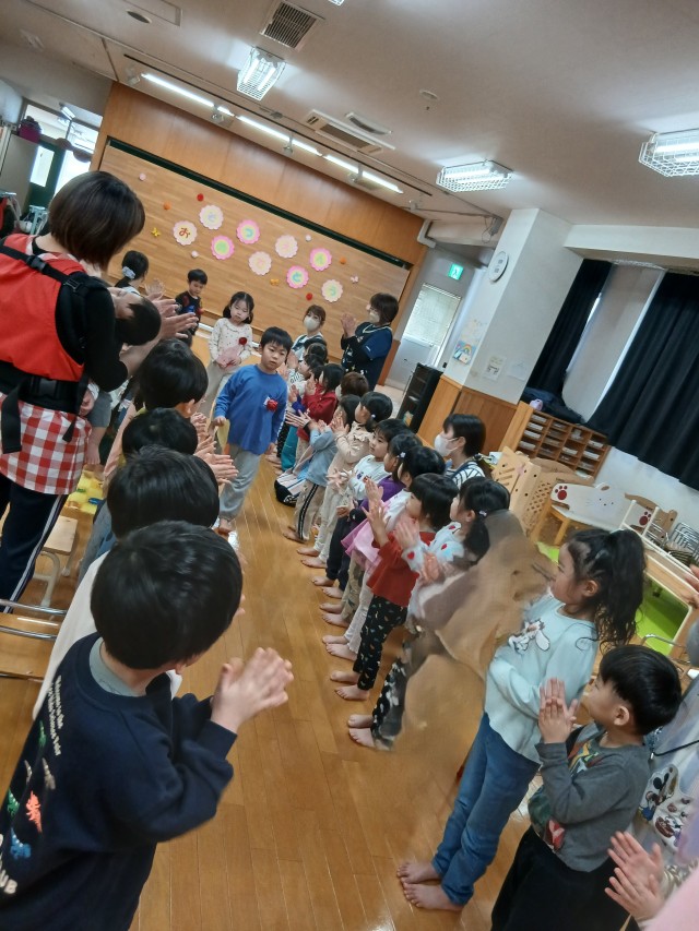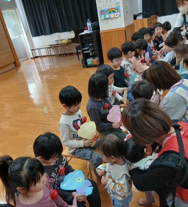 今日は、年長ゆりぐみさんとのお別れ会でした。ゆりぐみさんが、保育園に来てからのことを振り返ったり、0歳さんから年中 ばらぐみさんみんなで「ありがとう」の気持ちを込めてお花をプレゼントしたり、ばらぐみが代表してありがとうの言葉と、歌を歌いましたよ。