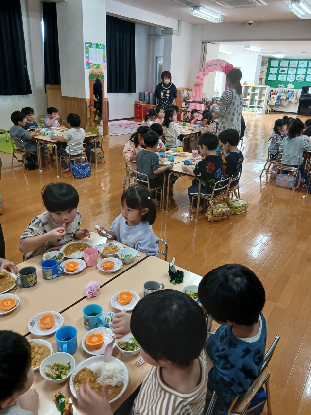 給食は、ゆりぐみさんのリクエストで「カレーライス」でした。2歳児さんからみんなで一緒に食べましたよ!